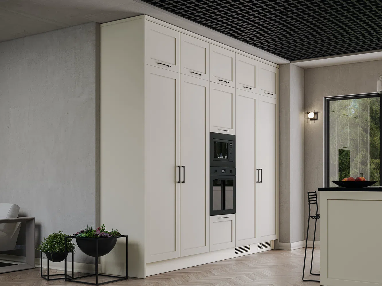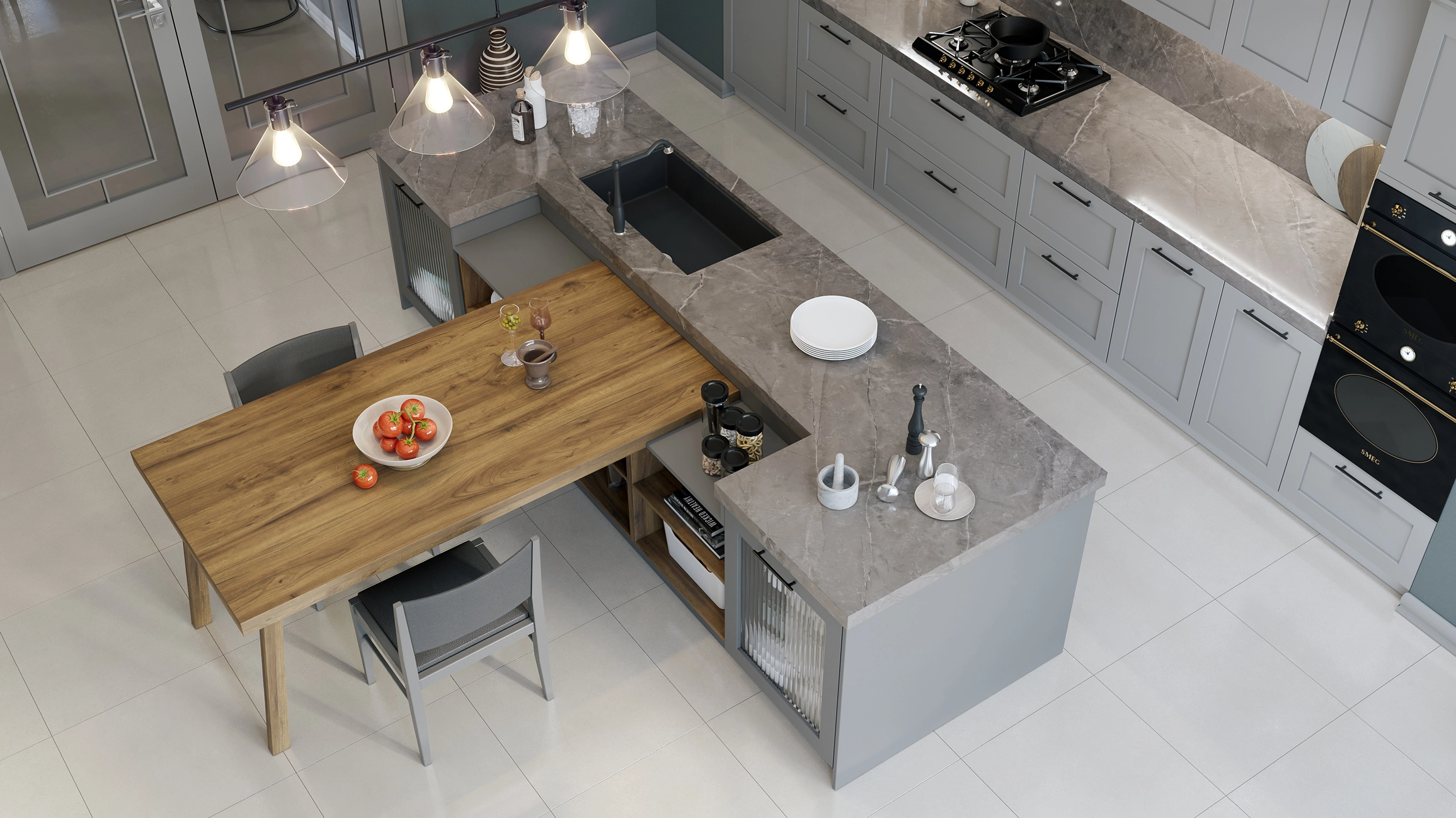 Stil ve işlevselliğin uyum sağladığı bu zamansız mutfakta sunulan derin çekmeceler, gizli çekmeceler, modüler açık raf üniteleri ve geniş tezgahlar tüm ihtiyaçlarınızı karşılıyor.